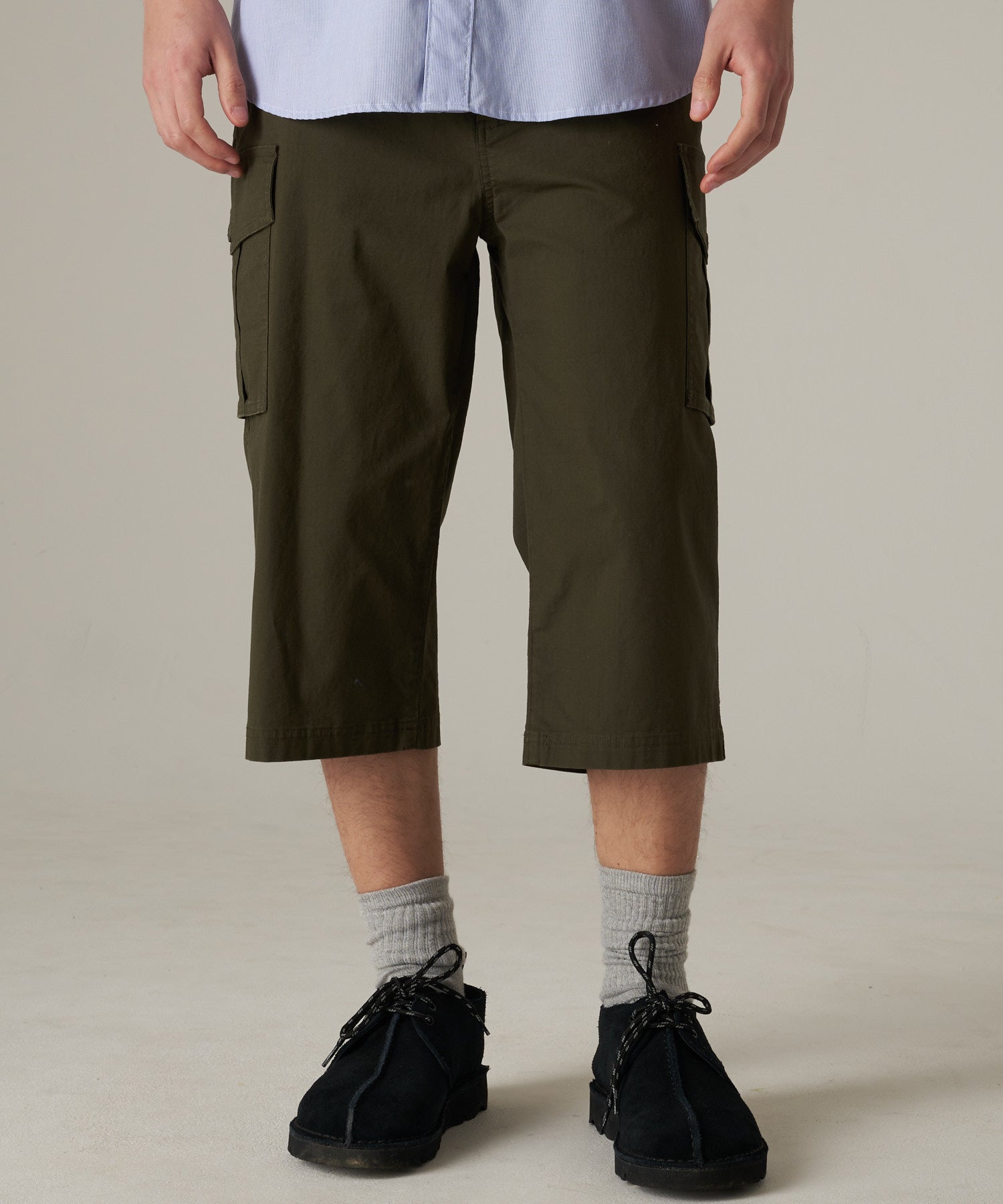 どことなく砕けた印象を生み出すカラフルな魚の総柄シャツを活かして、さらりとシンプルにまとめたワンツーコーディネート。膝から下が取り外せるナイロンパンツを取り入れることで即スタイルアレンジを可能とした、街から山まで満喫できる万能な装いがこれ。