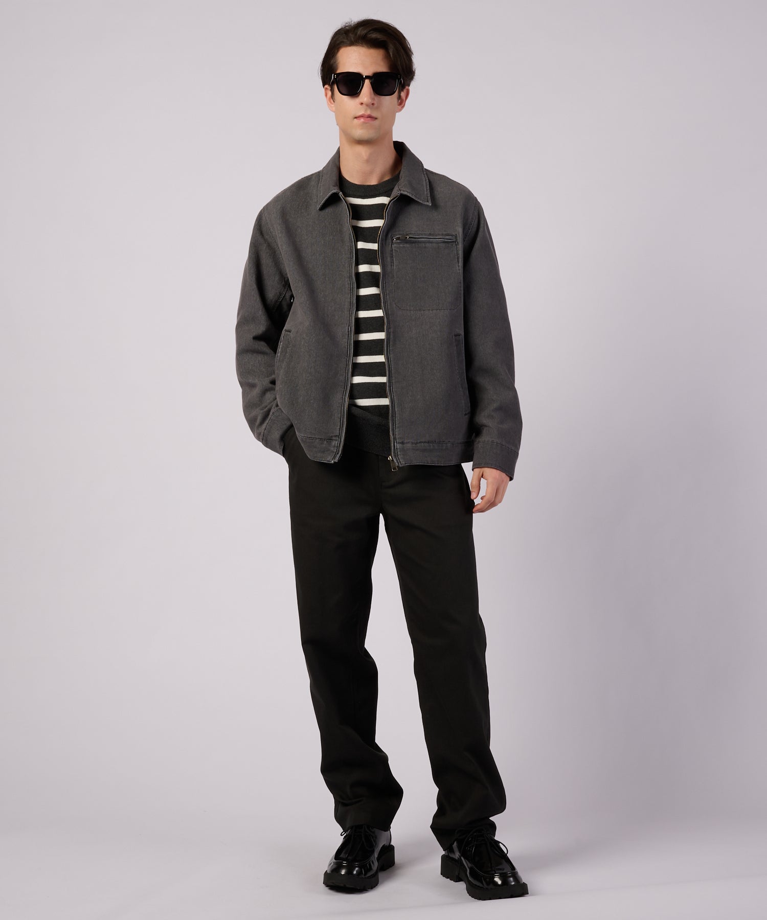 フロントジップ仕様のミニマルなデザインで、カジュアルになりすぎず、洗練された印象を演出。