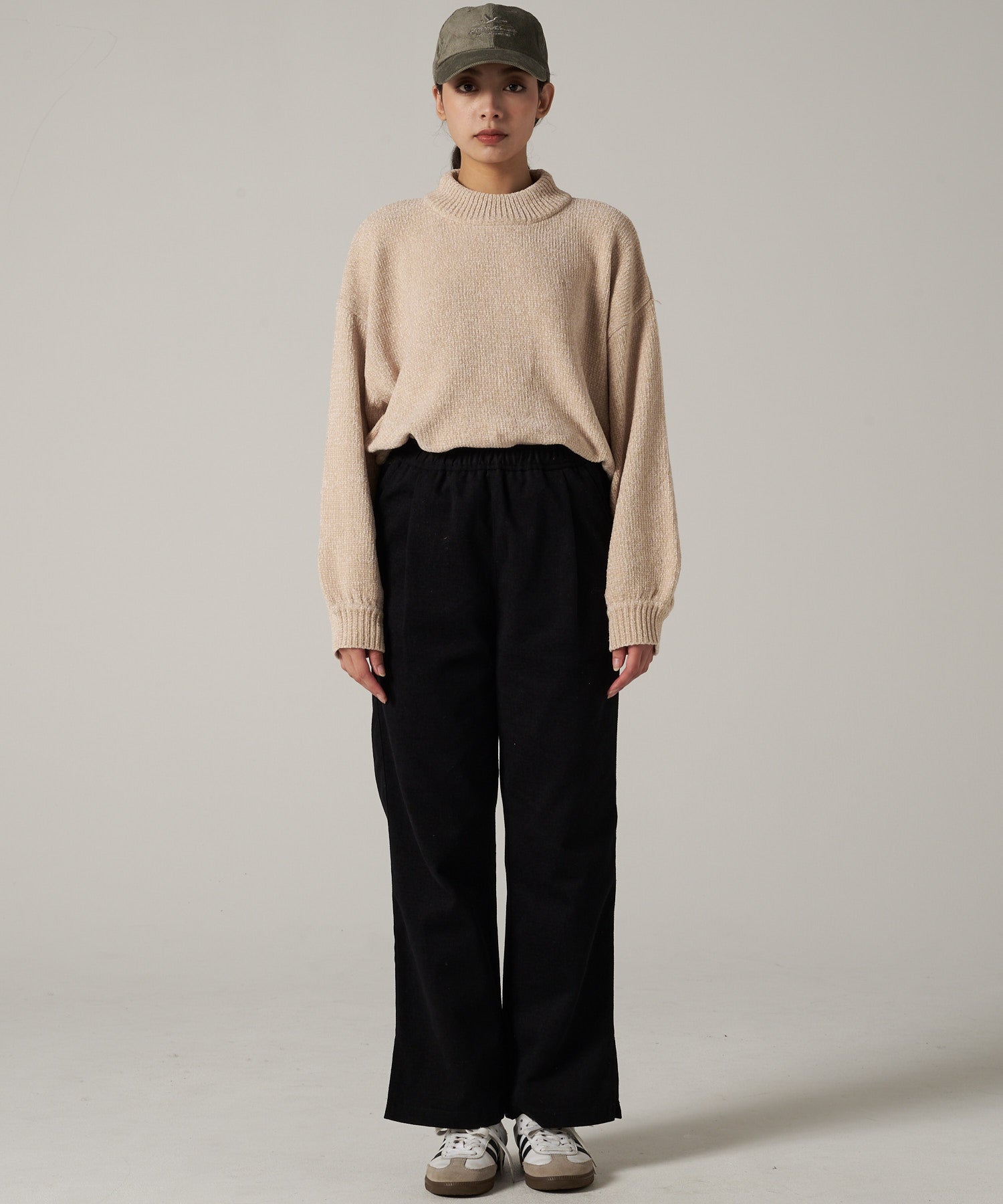 ウエストゴムで快適な着用感のまま、スタイルアップが叶うのがうれしいポイント。
