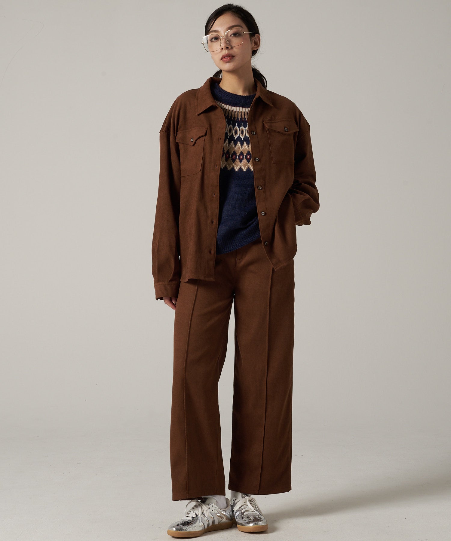 同素材のシャツ(E992632L)とのセットアップコーデもおすすめです。