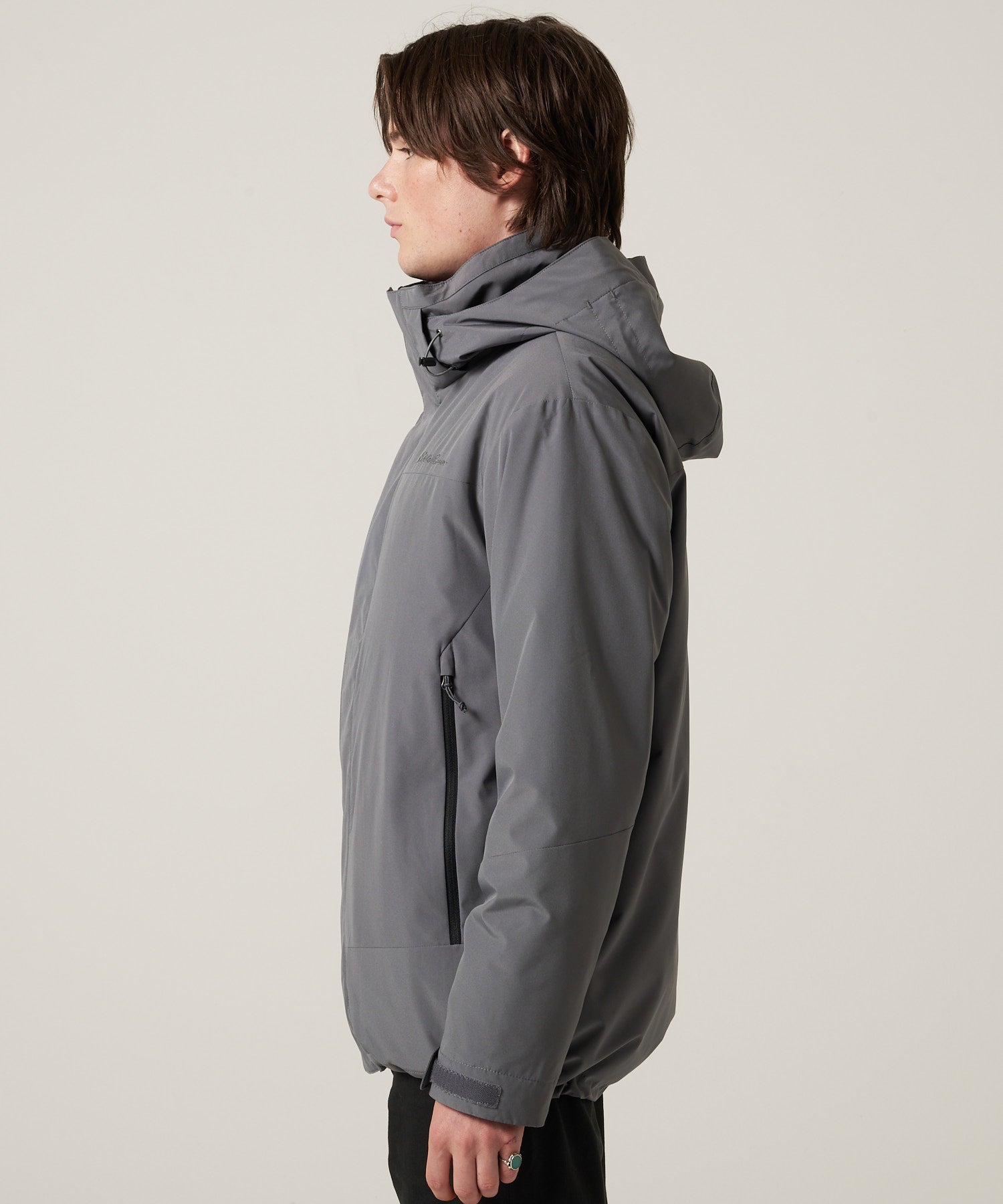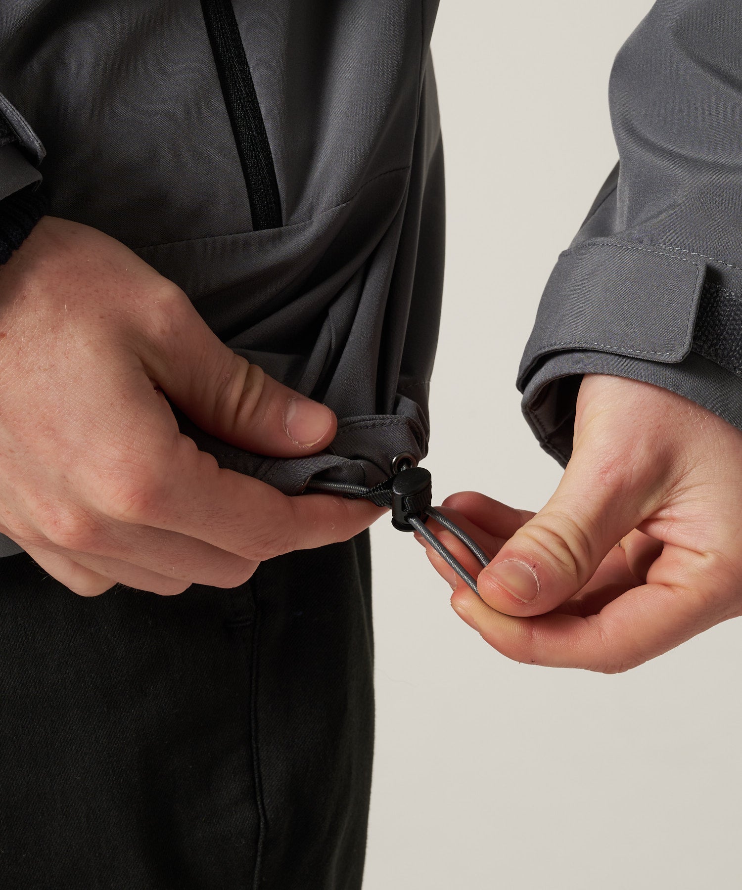 裾とフードはドローコード、袖口は面ファスナー仕様で防風性を高めつつ、脇下ファスナーで通気性にも配慮したアイテム。