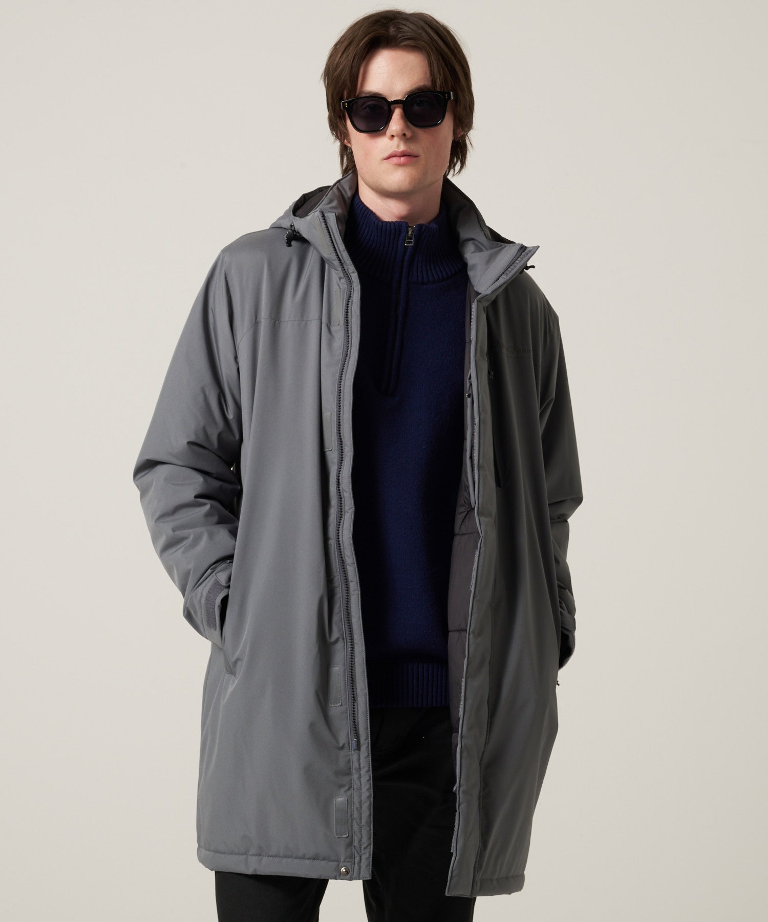 機能性と着心地のバランスが取れたシンプルなデザインのフード付きコートで、タウンユースのみならず、ビジネスシーンにも適した一着です。