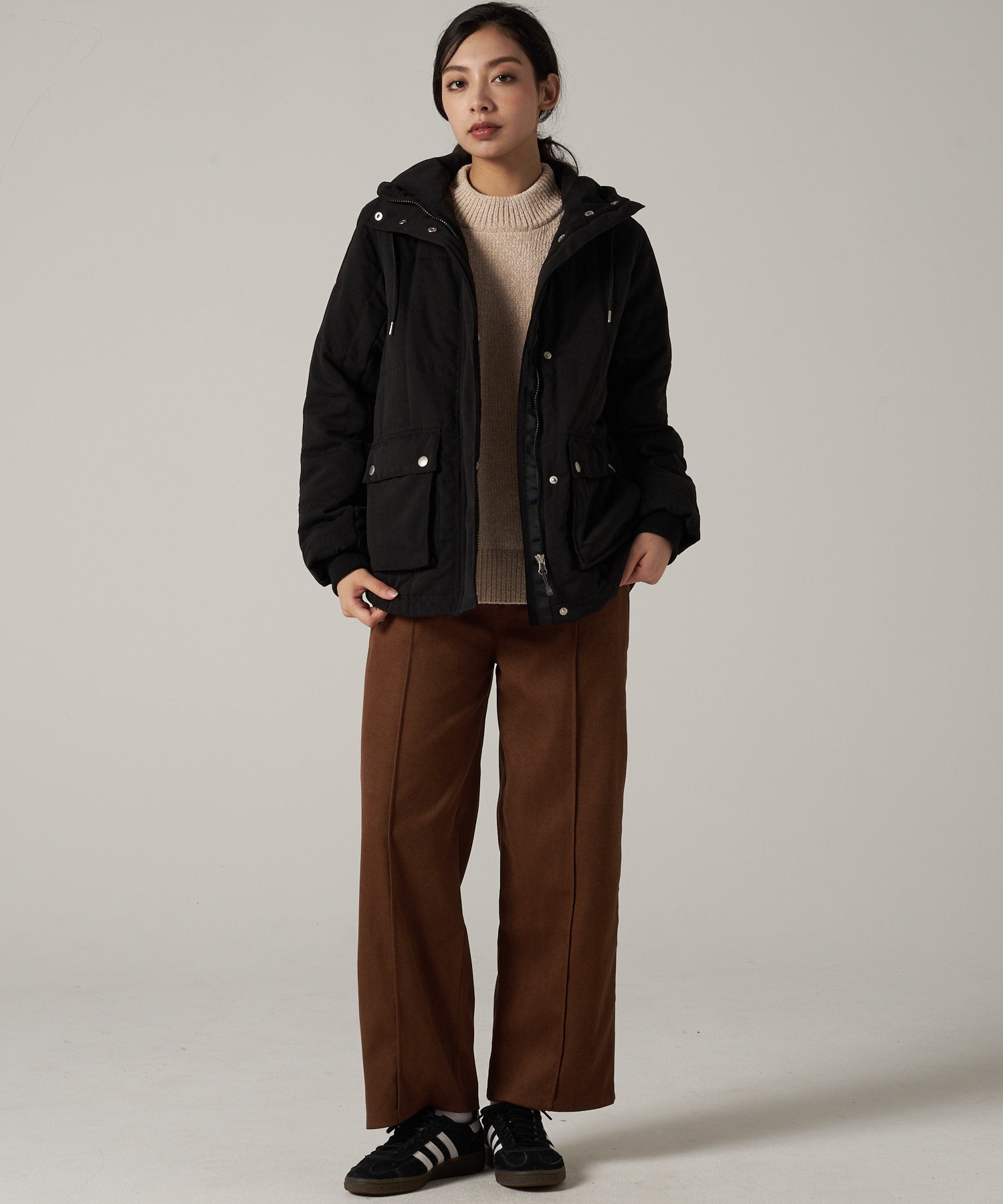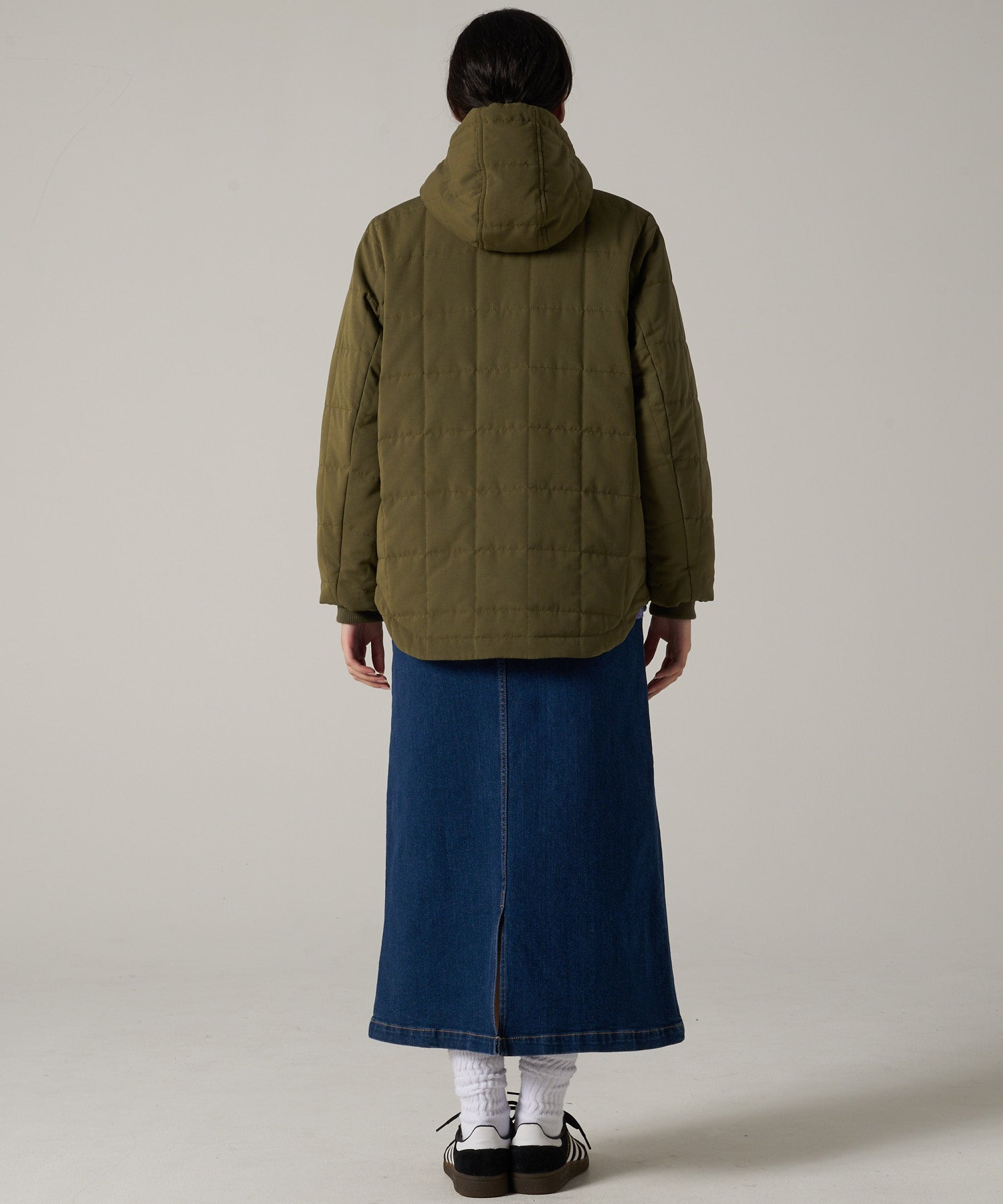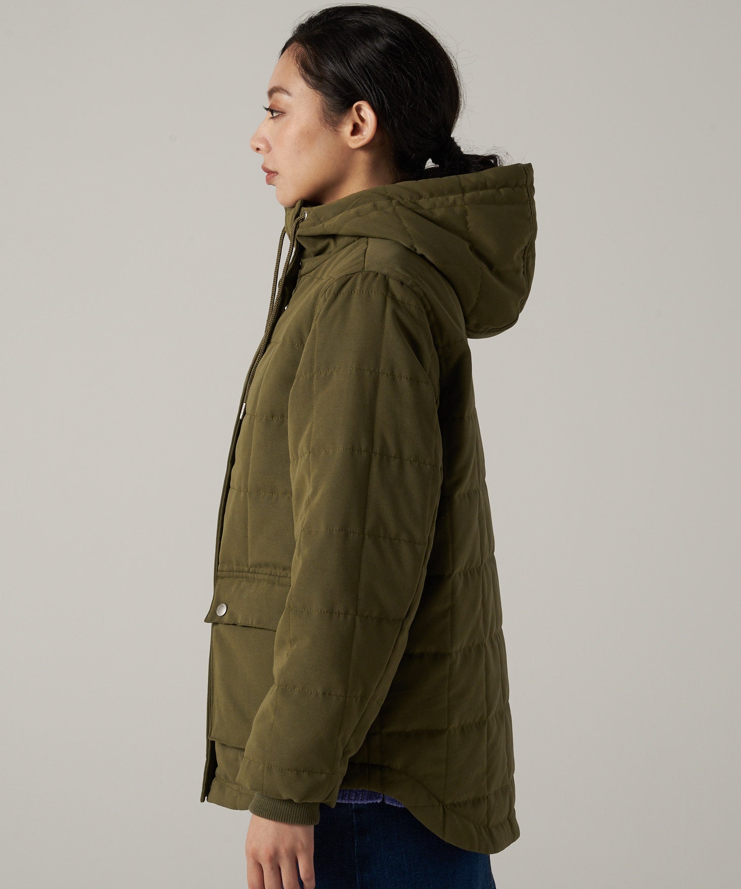 目を引くスクエアキルトが特徴の中わたフードジャケット。