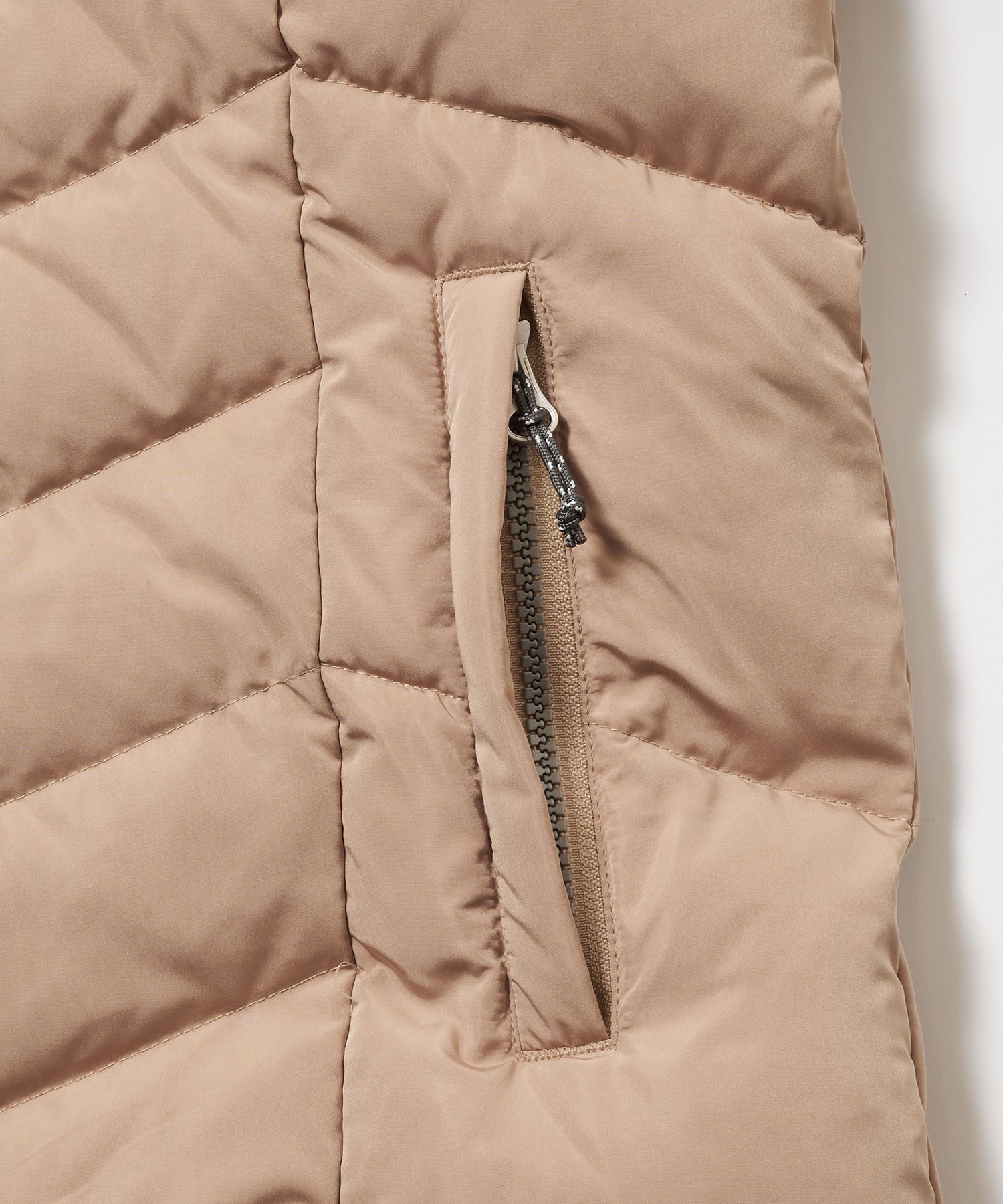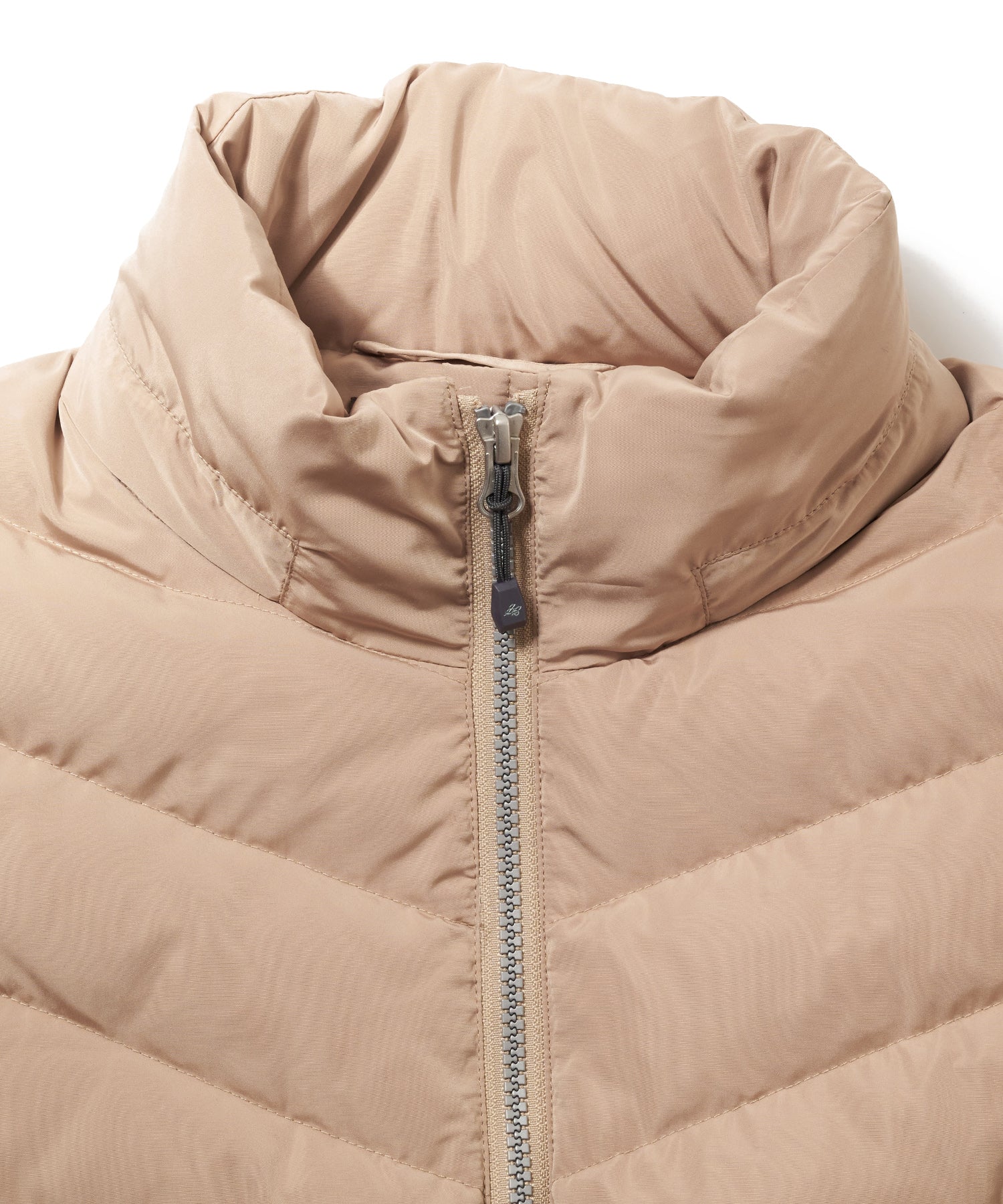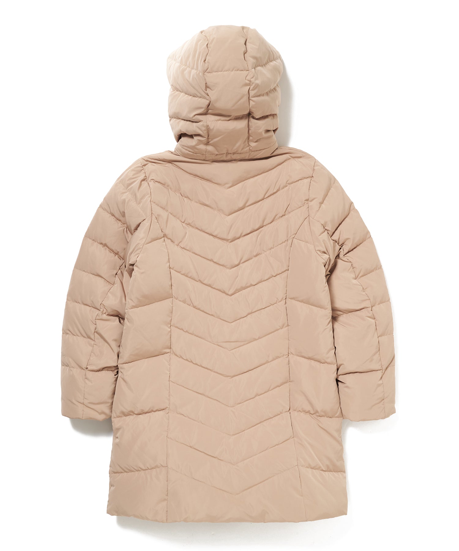 女性らしい立体感を演出し、V字キルティングや正面・背面・脇部分でキルトの切替段数を変化させ視覚的にウエストを細く見せることで、ボリューム感のあるアウターでもスッキリとした印象になります。