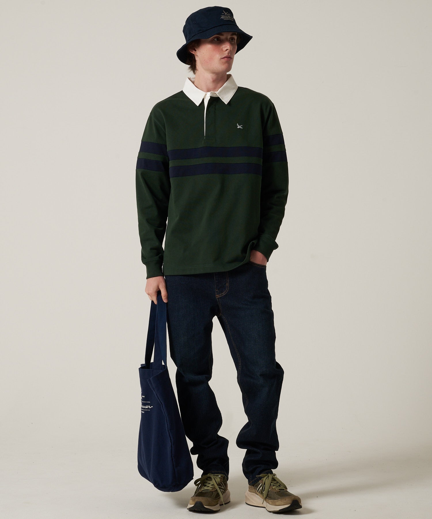 布帛切り替えの衿に比翼ボタンや、クラシックな雰囲気漂うパネル配色のようなラガーシャツデザインの定番形を踏襲。