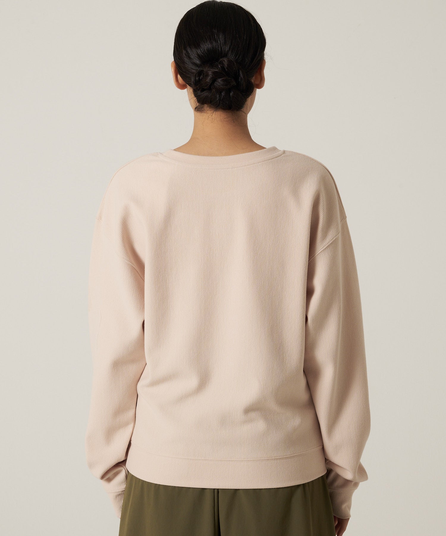 縦畝の布帛のような見え感で、無地素材でもきちんと感のある一着に。