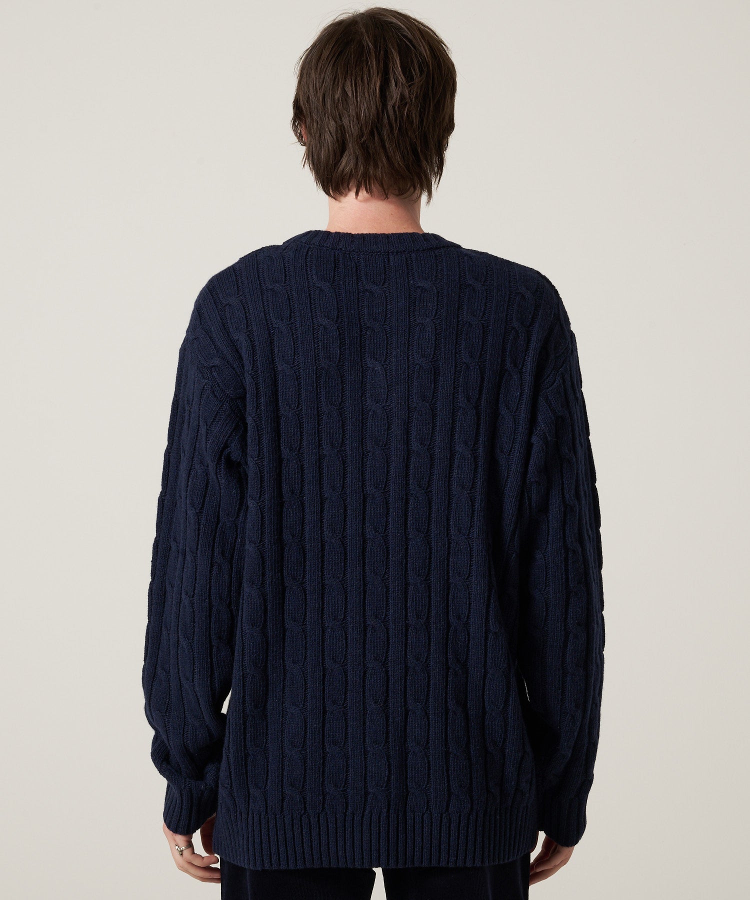 オーセンティックなスタンダードシルエットのケーブルニットセーター。