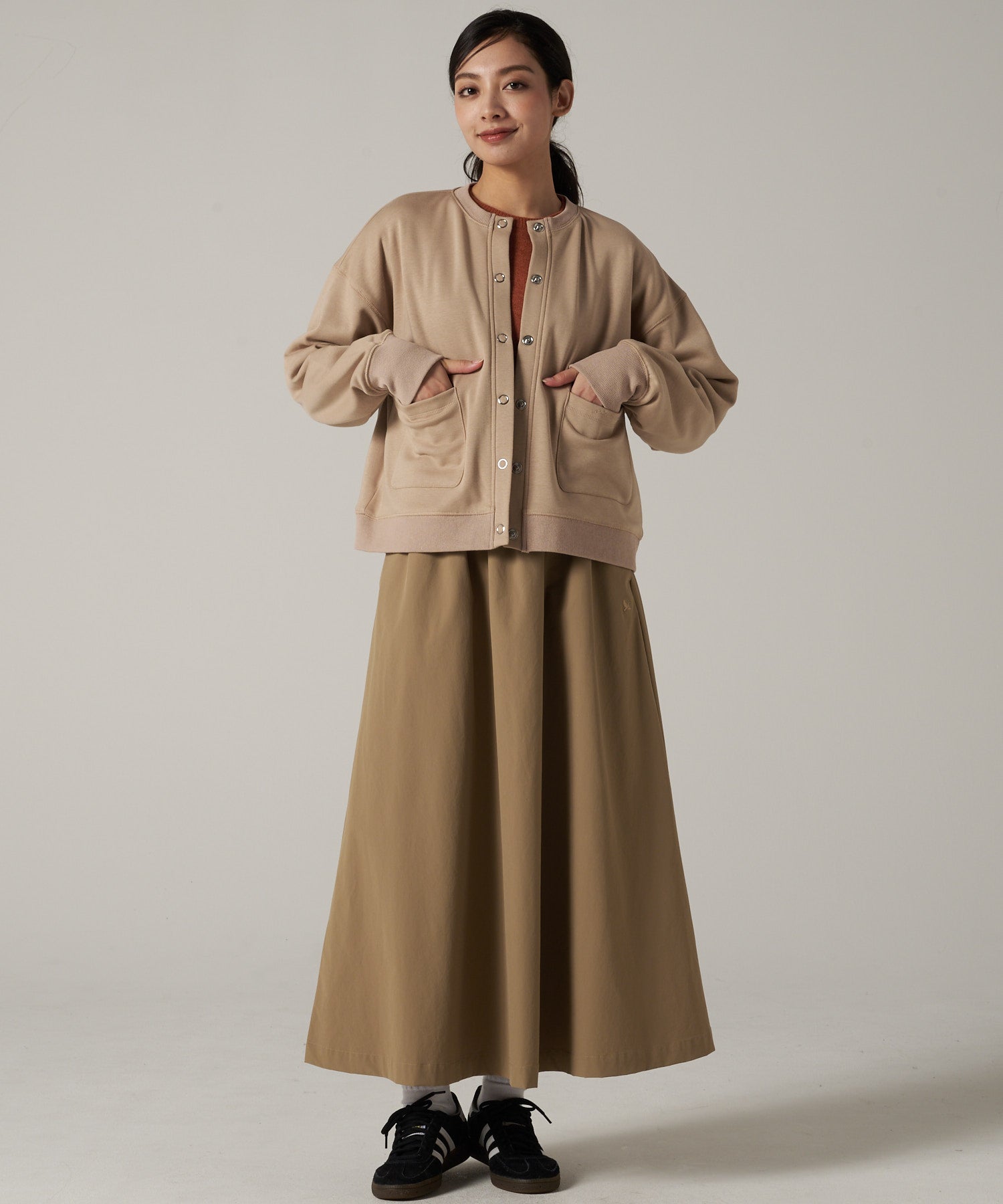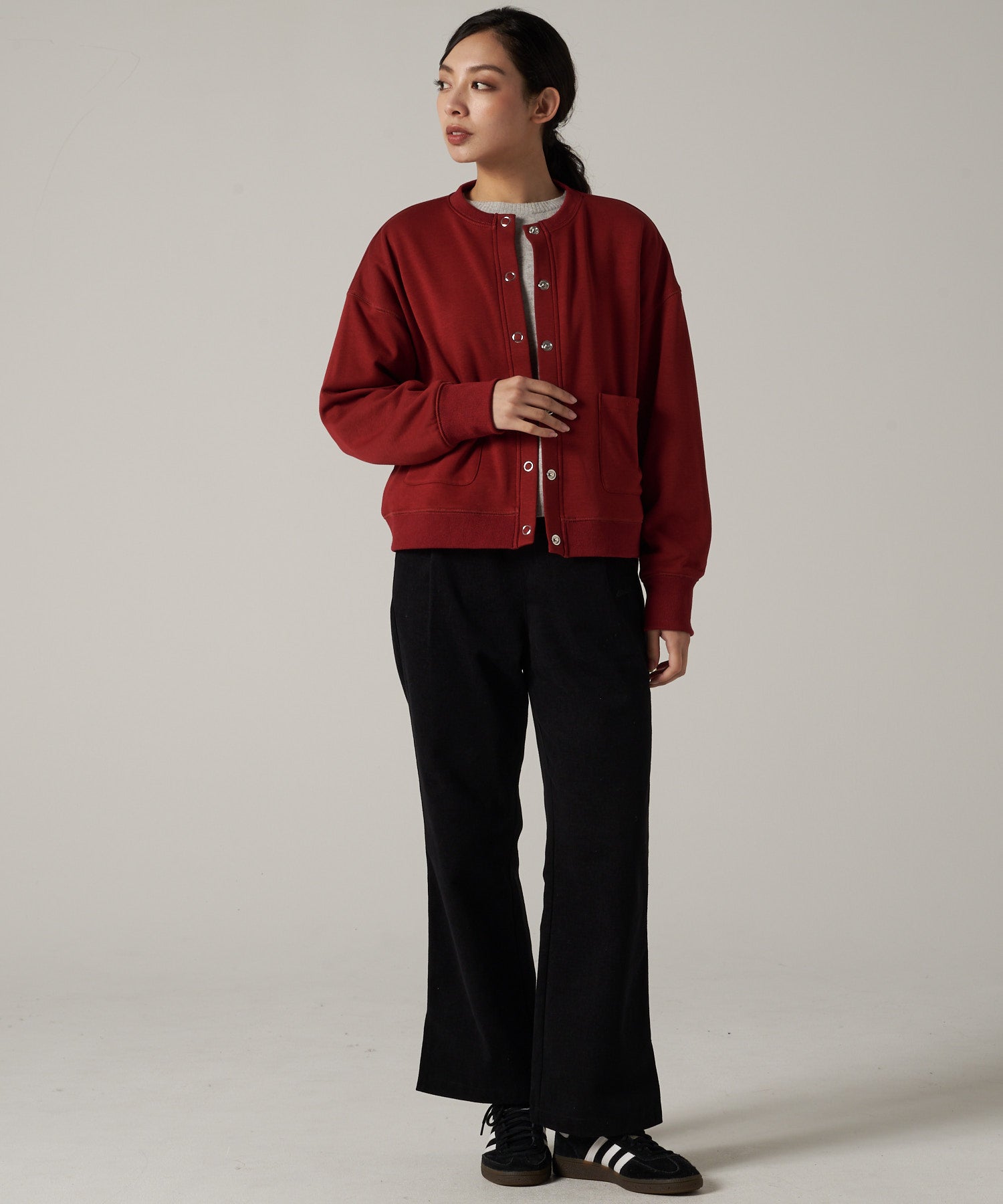 表面はスウェットのような生地感、裏面は起毛感のあるシャギー調になっており、寒い季節にも暖かく着用できます。