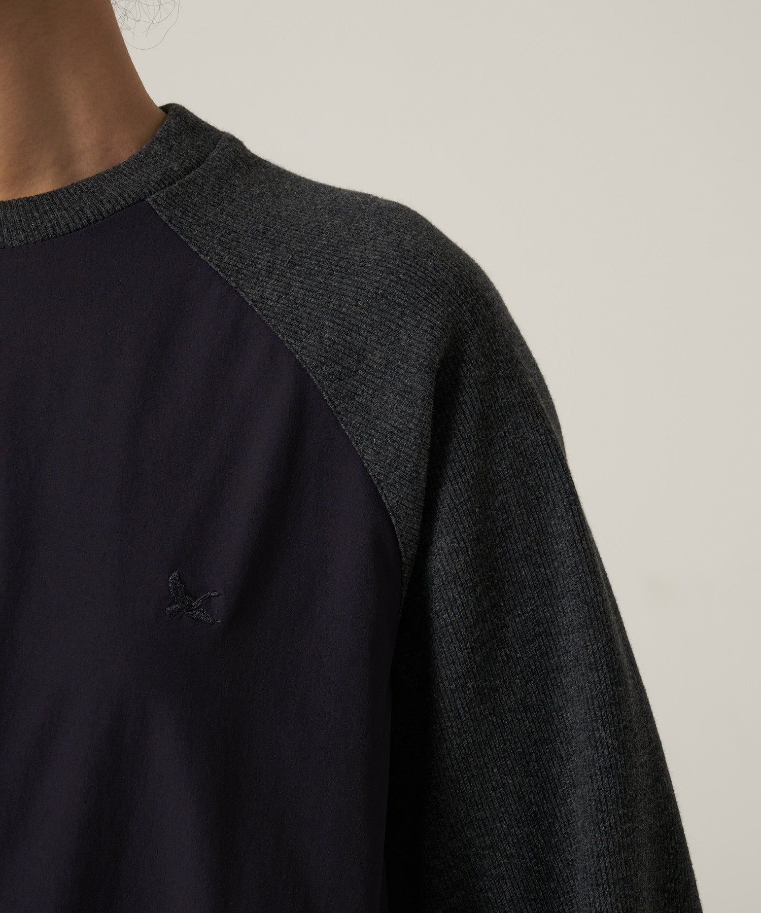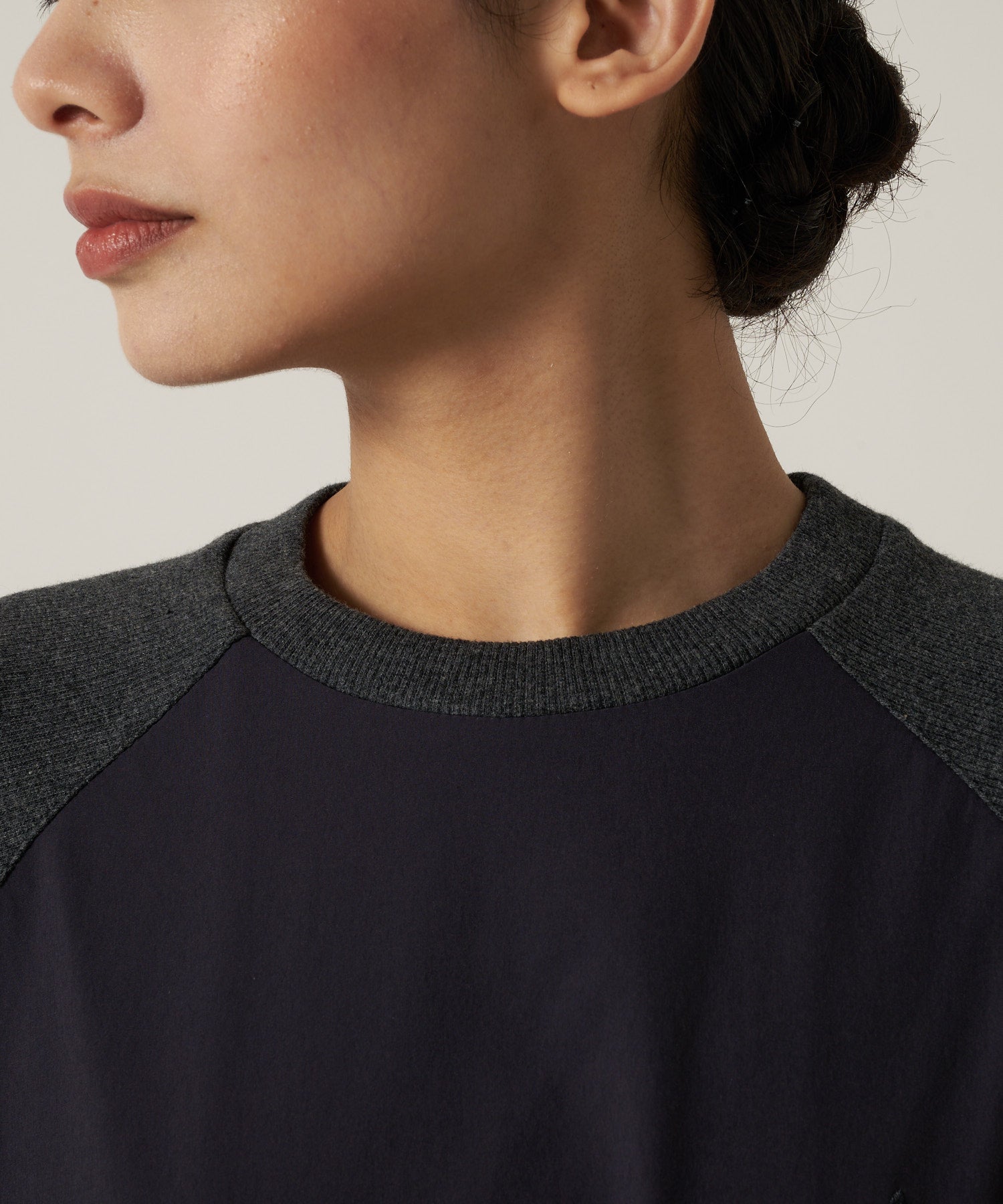 ラグランスリーブのデザインで、肩から袖にかけては伸縮性のあるリブ素材を使用しており、動きやすくストレスフリー。